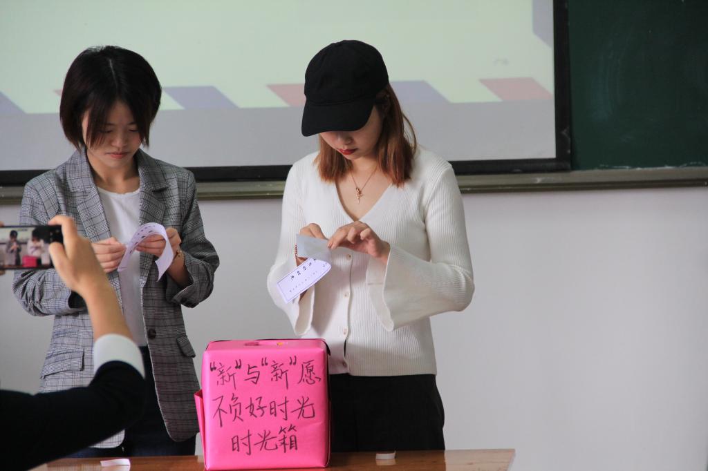 活动接近尾声,每位新同学在愿望卡上写下对大学的寄语,再由谢伶老师同18级酒店班负责人共同完成封箱仪式,最后将时间胶囊交由谢伶老师保存,三年之后再打开,让时间定格在2018年9月29日这一天。