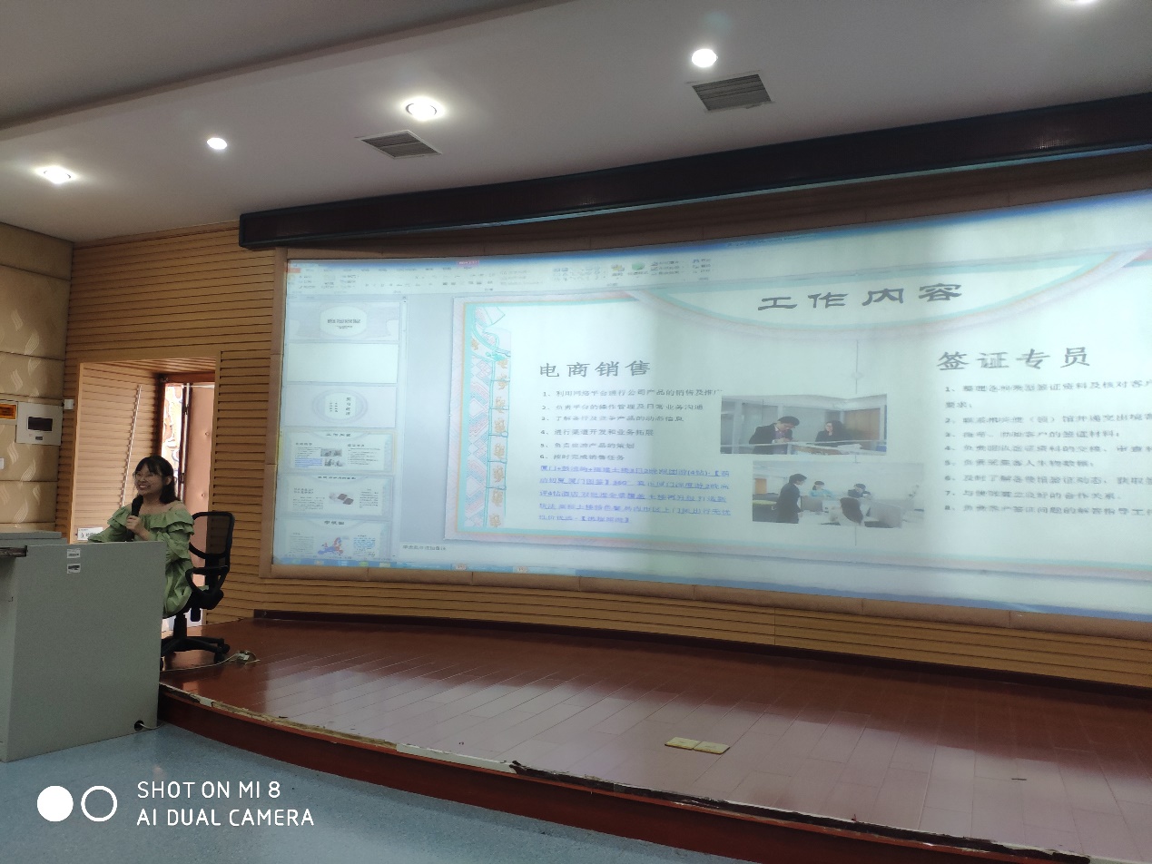 如春风般温柔的夏荣丹学姐用幽默丰富的案例对比了旅行社电商销售和意大利签证专员两份实习工作内容。她说自己在做线路海报的时候对图片、风格、颜色等都与技术部人员反复修订,甚至自学设计软件,直到得到自己满意的效果,这种对工作一丝不苟、力求完美的态度让她收益良多。看到来做签证的外国人跟自己的领导聊的很开心,而自己只能用蹩脚的英语问对方三个基本问题时,她鼓励大家要练好英语基本功,对自己的职业发展会有非常大的帮助。