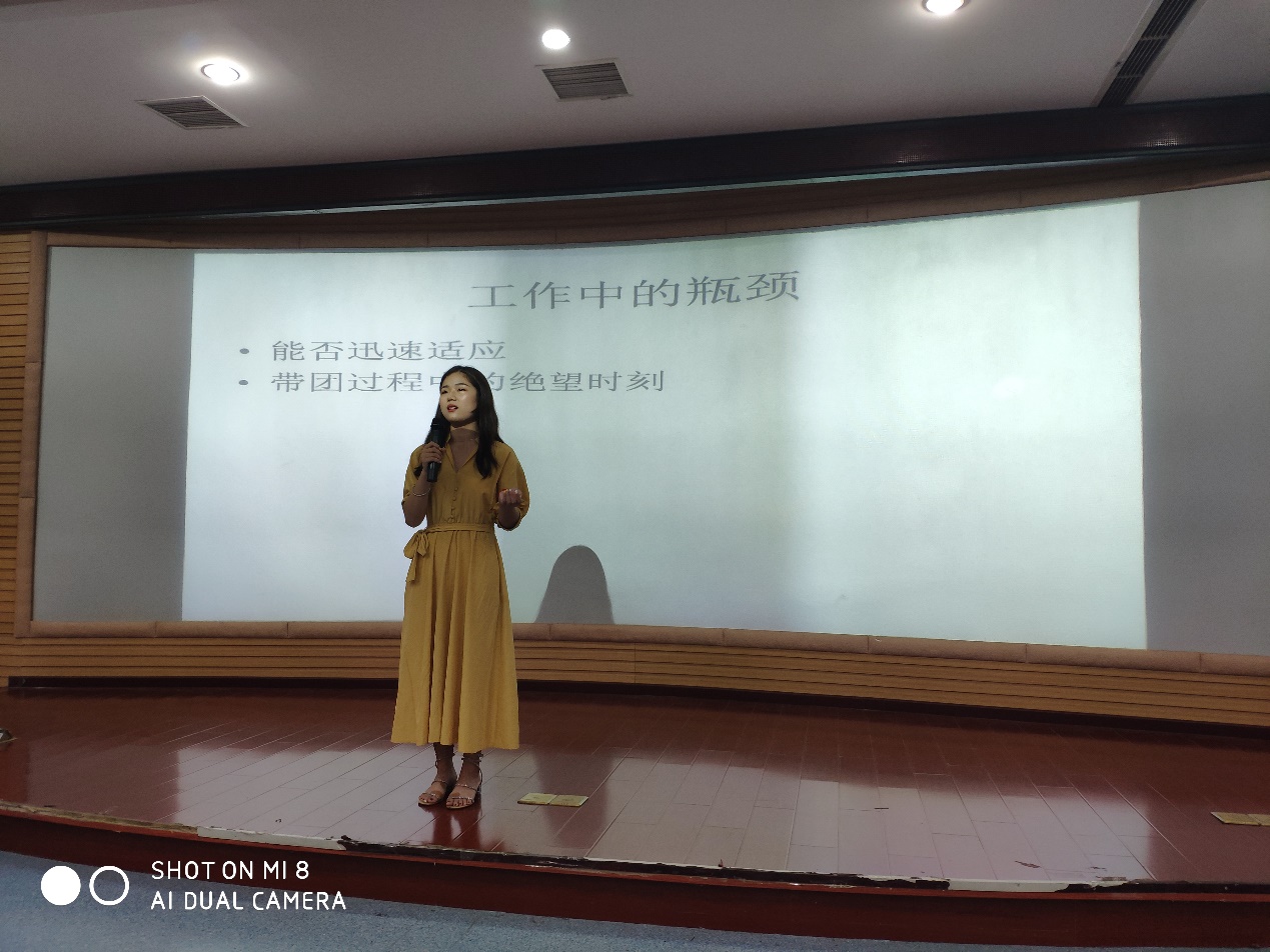 “实习,你准备好了吗?”,稳重务实的2016级学习委员姜开雪这样问大家,她用自己的会销导游经历讲述了自己实习工作中遇到的瓶颈,讲到动情之处眼中泛起泪花。她认为实习过程中最重要的是要调整心态,迅速适应工作环境,面对与学校、老师、同学完全不同的实习环境自己要练就强大的内心,遇到挫折在所难免,找老师聊聊天、向朋友诉诉苦都是很好的疏解方法。