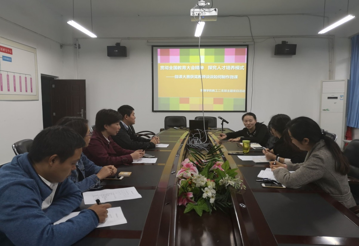 近日,管理学院党总支认真学习贯彻习总书记在全国教育大会上的重要讲话精神,积极开展教育思想大讨论,掀起学习贯彻全国教育大会精神的热潮。2018年10月24日下午14:00,管理学院党总支教工二支部在创新楼A110会议室举办了“贯彻全国教育大会 探究人才培养模式——微课大赛获奖教师谈谈如何制作微课”的主题党日活动。会议由管理学院党总支教工二支部的支部书记徐巧主持。