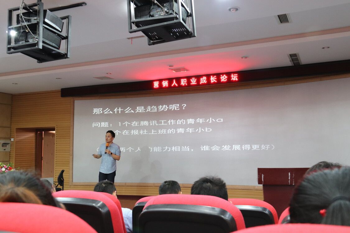 营销人职业成长论坛围绕着“能力本位、素能本位””的主题展开讨论。此次论坛我们邀请到的嘉宾是:新浪重庆房产事业部总经理易亮先生。会议上易亮先生为我们传道受业解惑,易总提出让同学们要学好专业知识,多参加社会实践;要具备职业规划能力、独立做决定的能力、职业化的表达能力,具有团队精神、懂得职场规则,形成一专多能的“多面手”。大家踊跃发言提问,易亮先生都一一为我们解答,受益匪浅。