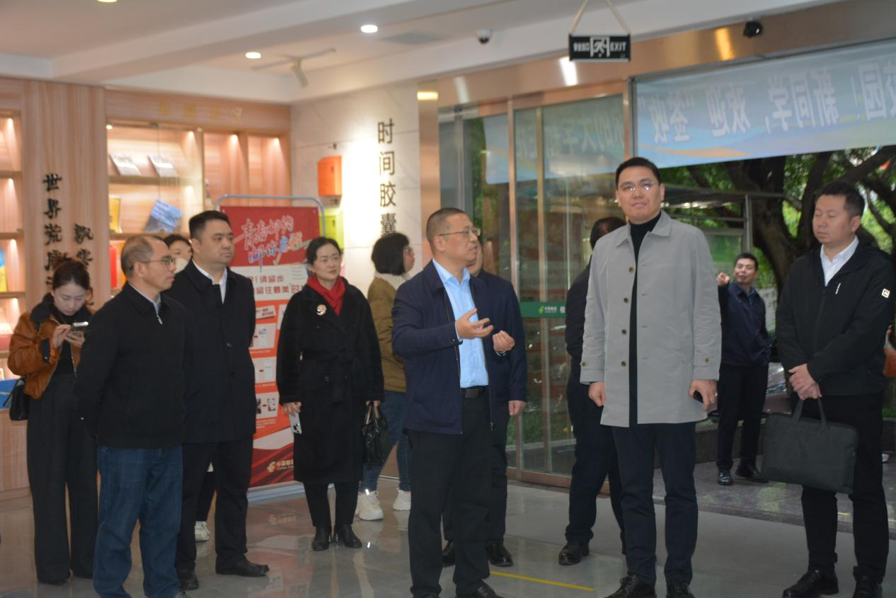周懿副区长一行重点实地考察了学校与中国邮政共建的校园邮驿生产性实训基地。管理学院党总支书记黄翔就基地的运营、学院的产教融合以及人才培养等情况进行了现场介绍。