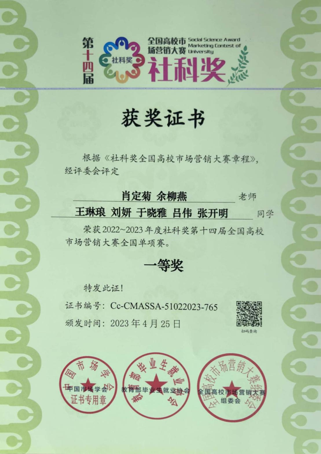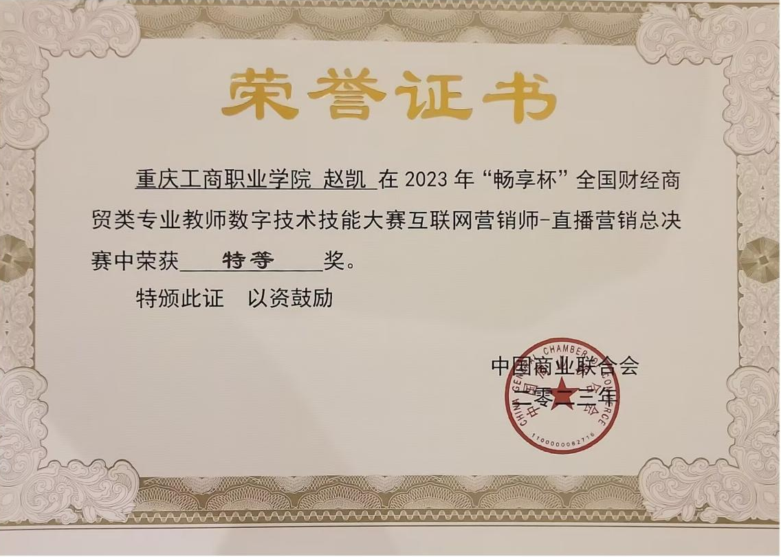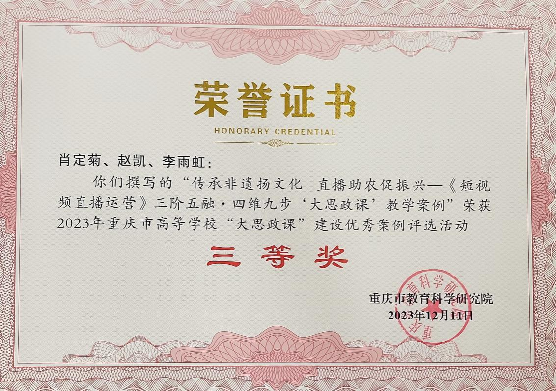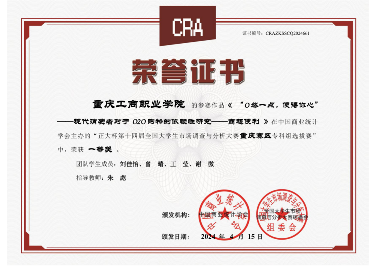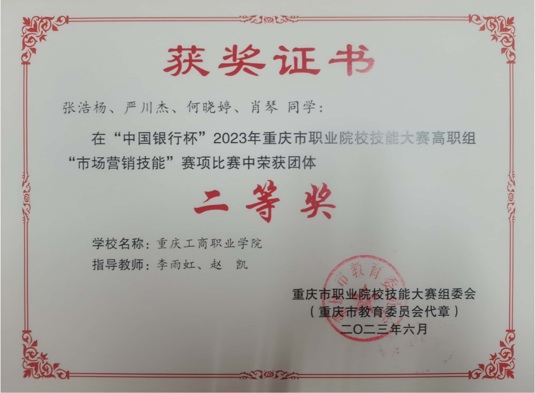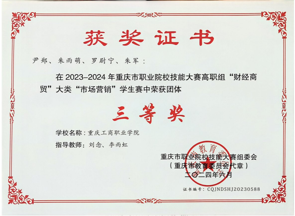 2.竞赛获奖成绩好。近三年来学生在全国高校市场营销大赛中荣获一等奖2项,二等奖3项;在全国大学生市场调查与分析大赛重庆赛区选拔赛中荣获一等奖1项,总决赛三等奖1项;在重庆市职业院校技能大赛二等奖2项、三等奖4项;在全国新职业技术技能大赛重庆地区选拔赛“互联网营销师”赛项中荣获三等奖1项。