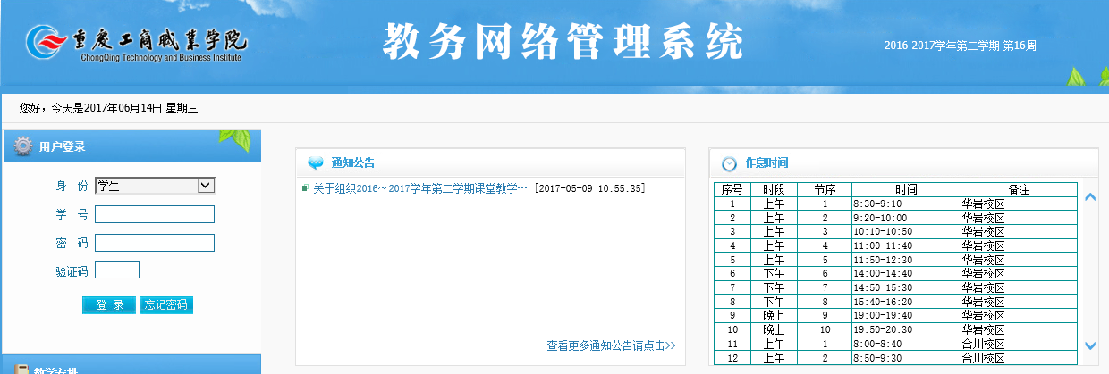 1.打开教务网络管理系统,网址:http://jwxt.cqtbi.edu.cn/,以学号和密码登陆该系统。(初始密码为学号,学生第一次登陆该系统后需要重设密码;如忘记密码且不能通过系统自主找回,请联系各学院教务科重置密码。)