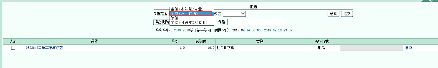 3.在弹出的选课界面中,课程范围选择“主修(公共任选)”,点击“检索”。