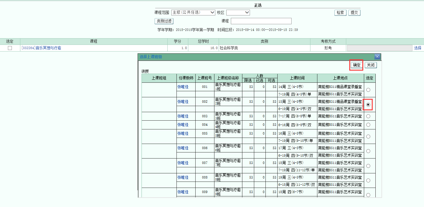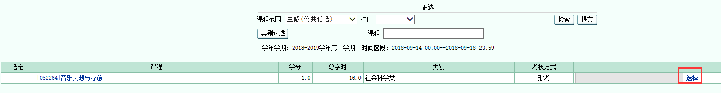 4.在显示的课程列表中,对感兴趣的课程点击“选择”,然后在弹出的“选择上课班级”对话框中“选定”适合自己上课时间的班级,点击“确定”,最后“提交”。