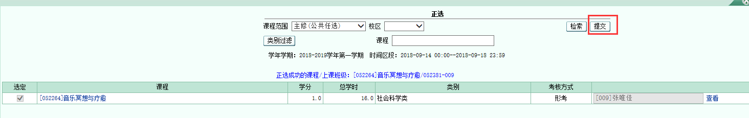 5.选课后,点击左边栏目的“正选结果”可以看到自己的选课记录,若对选择课程不满意,可在选课时间内退选后重新选择课程。
