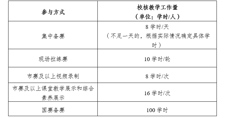2.认定工作量程序。教务处根据参赛教师的实际参与情况,按照表1计入参赛教师的课堂教学工作量,工作量仅限获奖当年认定。