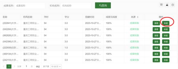 成果认证审核通过后,选择左侧“成果转换”菜单,根据课程代码选择相对应的转换规则,点击“申请”,等待管理员审核。可在“我的申请”查看审核进度。