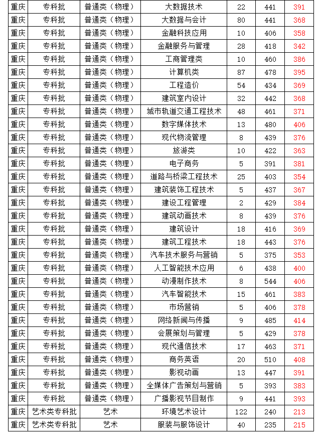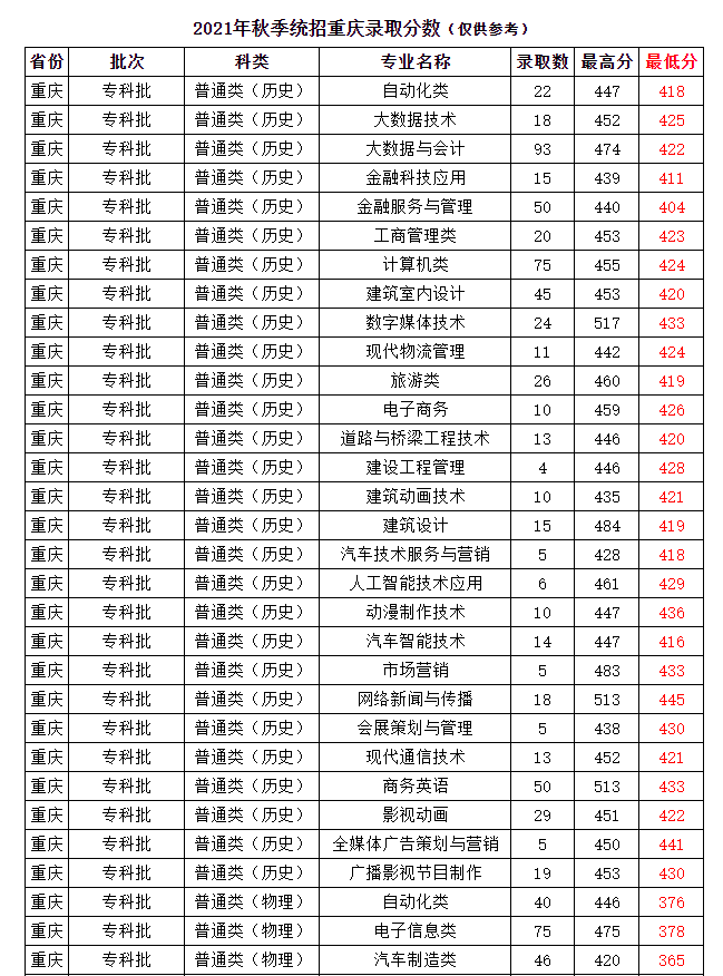 2021年秋季统招重庆录取分数(仅供参考)