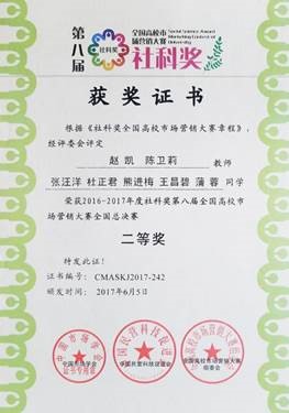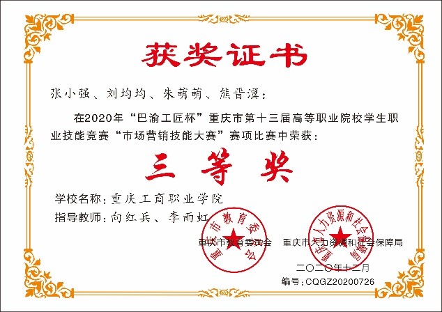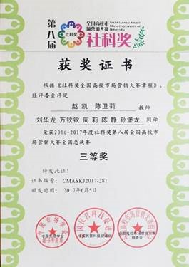 市场营销专业(国家骨干专业、重庆市示范重点专业)在完成专业建设的同时,人才培养效果也取得了累累硕果。在教学中注重教学形式的多样化,组织学生参加各级技能大赛,部分获奖情况如下:重庆市首届“创青春”金奖;重庆市营销技能大赛二等奖和三等奖;第八届“社科奖全国高校市场营销大赛”中获得二等奖、三等奖;第八届中国“互联网+”大学生创新创业大赛重庆赛区银奖;第十三届挑战杯中国大学生创业计划竞赛重庆赛区银奖;第八届社科奖全国高校市场营销大赛二等奖、三等奖等荣誉。