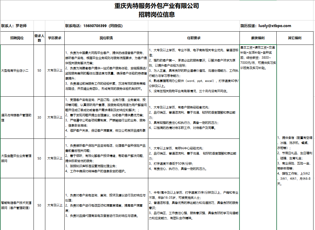 重庆先特服务外包产业有限公司招聘岗位信息