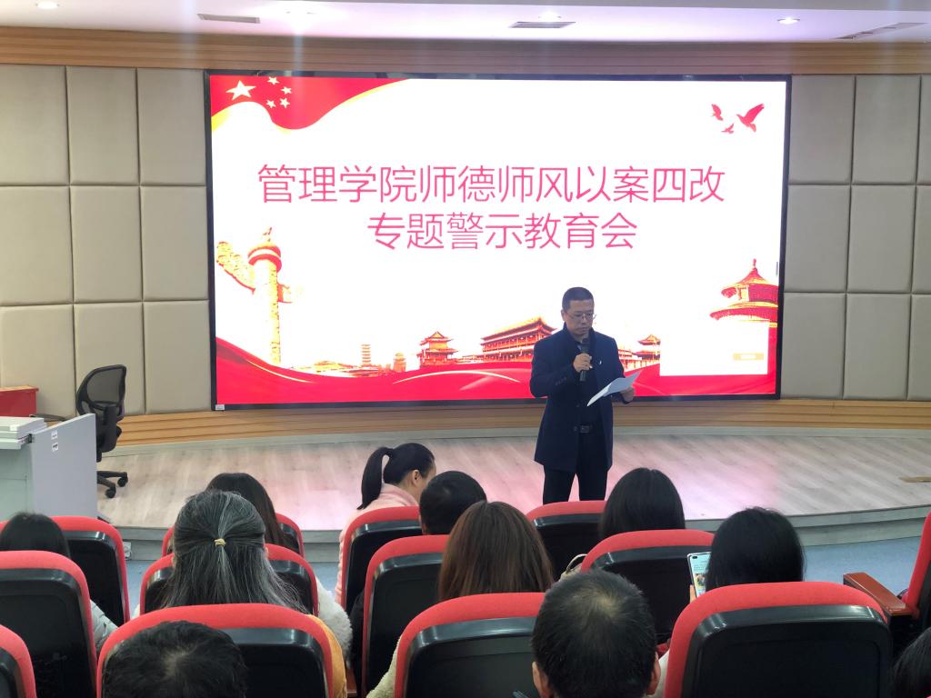 本次警示教育会以学院近期发生的师德师风典型案例为鉴开展学习教育。学院院长黄翔、副院长杨波、党总支纪检委员黄宗林分别就学院典型案例作“以案改治理”、“以案改监管”、“以案改作风”主题发言,表示坚决拥护党中央决定,并结合自身认识和工作实际对案件进行深刻剖析。