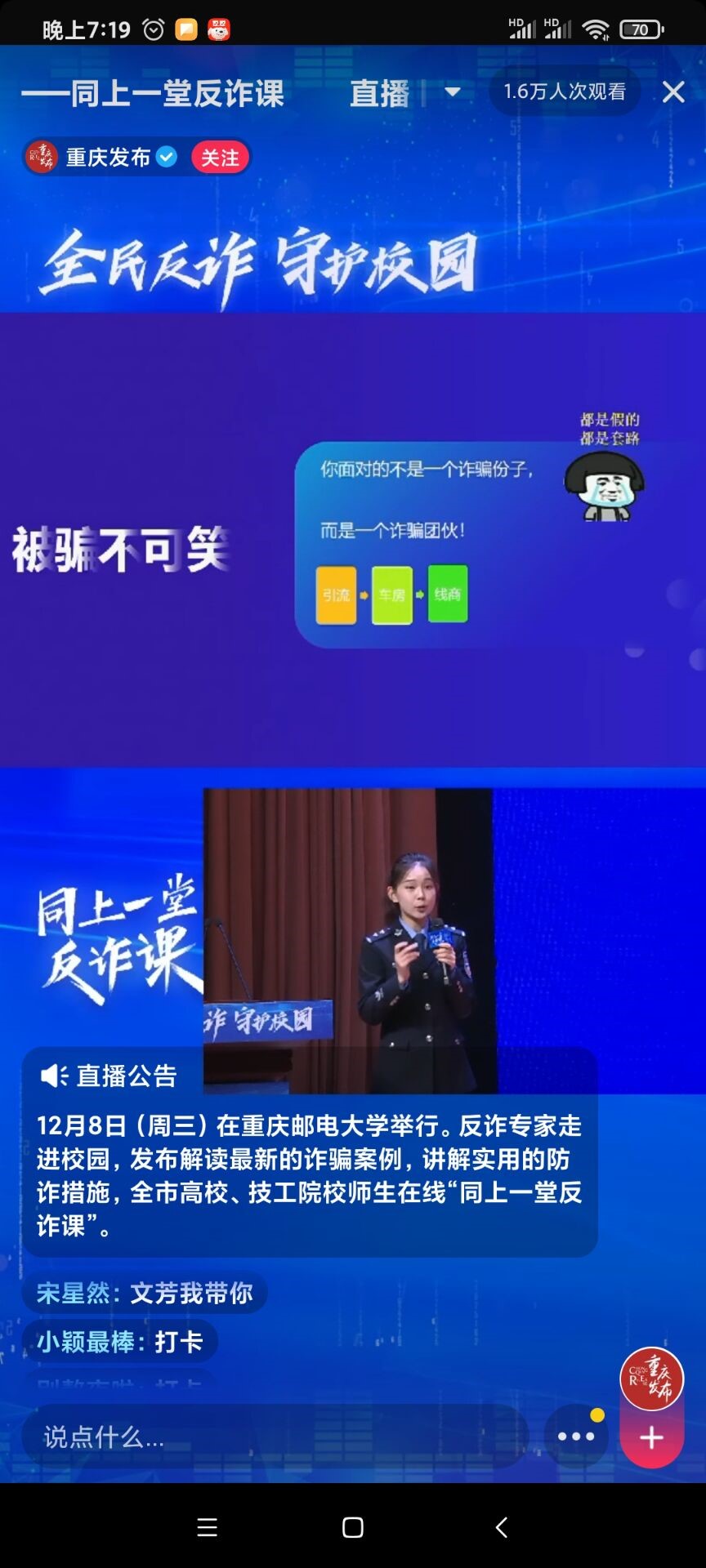 12月8日,由市教委、市委宣传部、市委网信办、市公安局、市人力社保局主办、市反诈骗中心、中国电信重庆公司、重庆邮电大学、人民网重庆频道、南岸区公安分局共同承办的“全民反诈,守护校园——同上一堂反诈课”发布活动在重庆邮电大学举行,并通过抖音等网络媒体同步直播。管理学院党总支三支部第一时间组织全体党员观看直播,并进行研讨。