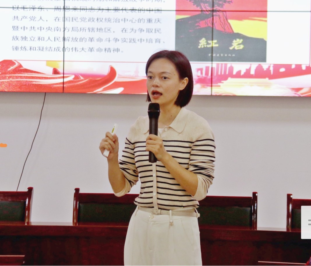 传承红岩精神,凝聚奋进力量。活动中,智慧文旅教工党支部杨华书记作了主题分享,她以“重庆城市精神核心,红岩精神代代相传”为主题,围绕红岩精神的实践来源、主要内涵和历史地位三个方面,对红岩精神的形成、红岩精神的政治灵魂、红岩精神的实践遵循、红岩精神的内在风骨及红岩精神的革命烈士等方面进行了详细的讲解。在场的社区阿姨、老师和同学们纷纷表示,要把红岩精神继承好、发扬好、践行好,让红岩精神在合川生根、开花、结果,为建设现代化新合川凝聚强大精神力量。