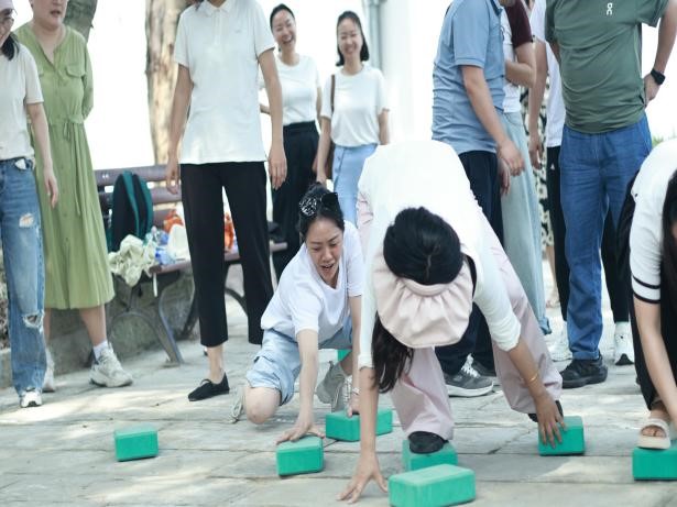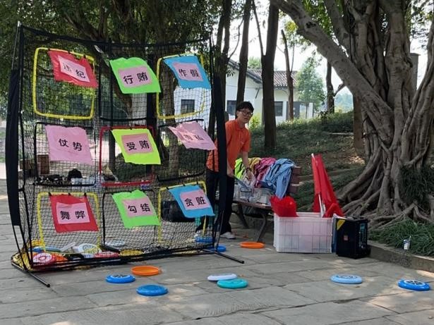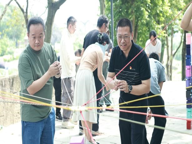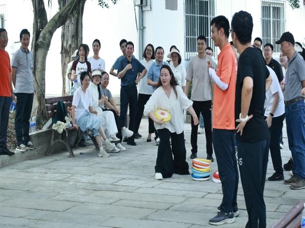 拓展活动锤炼实干作风。在团队拓展环节,教师们分为4组,通过特色行动化实践项目,磨砺协作能力与廉洁意识。“同心筑塔”与“摸石过河”项目,通过实践考验团队分工与务实精神,彰显“红岩先锋”变革型组织的先进性。而“击中廉心”项目中,飞盘靶场化身“廉洁考场”,老师们每一声“中靶”的欢呼,都是对廉洁底线的庄严宣示。