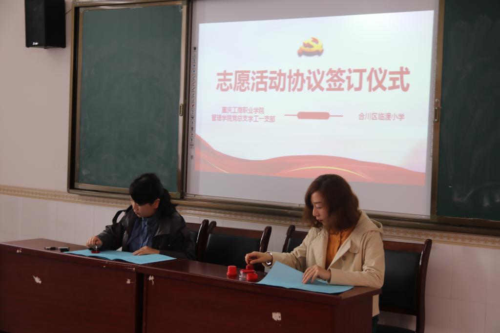 本次活动共有三个环节,一是心愿达成仪式,重庆工商职业学院管理学院党员师生一对一给小朋友赠送礼品;二是爱心趣课堂,由何跃老师和童文军老师分别给小朋友分享大学的趣味课堂,现场气氛活跃,小朋友们表达了对大学校园的向往;三是志愿活动协议签订仪式,由合川临渡小学校长王帆老师与我校管理学院学工一支部书记程元梅老师签订志愿活动协议书,今后学工一支部将与临渡小学展开持久的党员实践岗对接活动,双方就此达成协议。