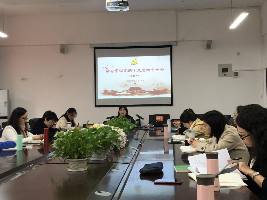 2019年11月13日,管理学院党总支钟茜书记开展“学习贯彻落实党的十九届四中全会精神”为主题的专题党课,传达十九届四中全会精神,管理学院全体教师党员参加学习。