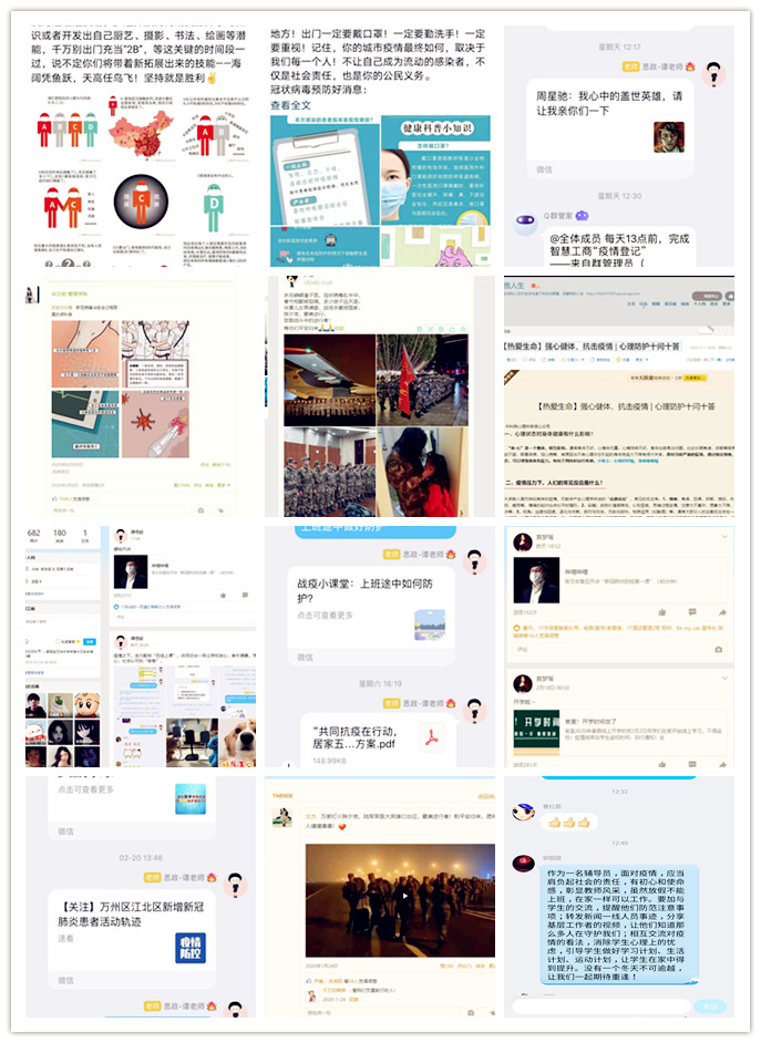 学院辅导员本着围绕学生、关照学生、服务学生的宗旨,时刻关注湖北武汉等地及咳嗽、发热学生,关心学生思想状态,开展每日疫情登记。袁丽红老师通过空间日志向学生宣传“强健身体抗击疫情-心理防护十问十答”;高平老师定期给大家科普疫情防控知识;尹博老师身体力行带领大家向“最美逆行者”致敬……