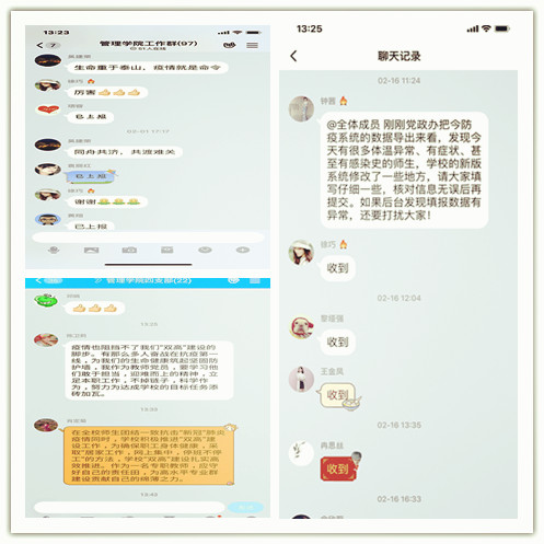 自疫情爆发以来,学院领导紧密部署成立疫情防控工作组,钟茜书记亲自指导监督,通过电话、QQ群、微信、亲属等多种途径联系全院师生,并对湖北籍,武汉市的师生进行一对一帮扶、关心、资助,并按照学校要求每日联系全院师生完成健康情况及行程上报,确保信息准确,构筑起我院疫情防控网络,搭建起师生沟通的桥梁。