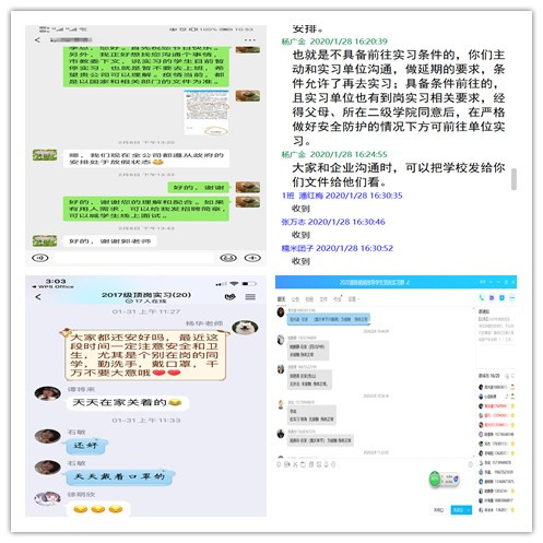 疫情发生后,针对大三顶岗实习,指导教师和辅导员第一时间了解、关心学生,并把疫情防控知识及学校要求传达到每位同学,通过“线上沟通线上管理线上宣传”等方式进行防疫知识科普、心理疏导、价值引领,确保师生联系永畅通。“老师,企业不同意我们暂停实习,怎么办?”2月6日,管理学院刘冬梅老师收到她毕业顶岗实习的学生发来的消息。刘老师在了解清楚情况后,第一时间与学生、企业进行了沟通,后上报给学院领导,郭小路科长马上与家长、企业取得联系,就此事进行沟通,暂停顶岗实习学生复工,复工时间等政府通知,并让企业和学校随时保持联系。校、企、家联动为毕业生保驾护航,像这样的事例还有很多……
