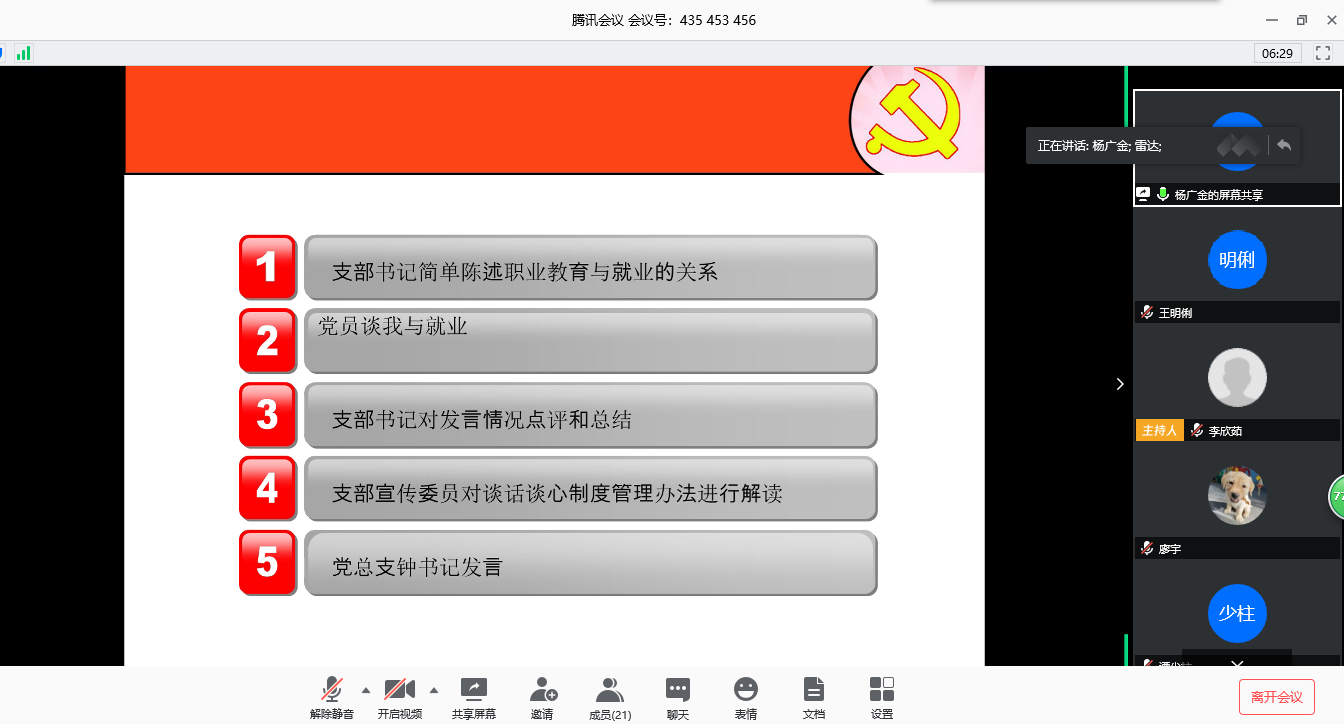 杨书记在活动中对职业教育与就业的关系进行了简单陈述,指出职业教育是以就业为导向、以服务为宗旨的教育,强调就业工作是长期的核心工作,也是当下的紧迫任务。教师党员王明俐同志表示,应鼓励学生在校期间,利用课余时间进行兼职,积累工作经验,对于参加专升本考试的同学,建议其复习、就业两手抓。雷达同志表示,学校应注意引导学生树立正确的择业观,克服眼高手低、慢就业等思想,先就业再择业。行政部门党员谭少柱同志从校企合作角度谈了对促进就业的看法,强调应加强校企之间的深度合作。同时,该同志也指出,目前我院订单班比例偏低,应加大订单培养的数量。辅导员尹博同志强调,就业不是毕业班的事情,从学生入学开始,就应向其灌输就业的思路和理念,通过职业生涯规划和毕业生经验分享等方式,端正学生的就业观和择业观。毕业班党员黄志强同志目前在永辉电商部实习,表示疫情期间工作压力较大,虽然有时工作很累,但仍在坚持。该同志强调,要积累足够经验后再择业。支部其余党员也结合自身情况,发表了对就业的看法。