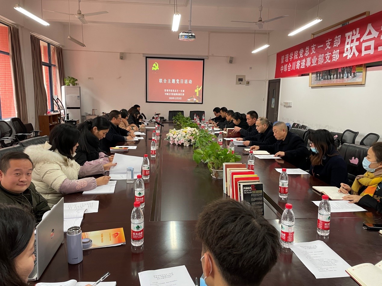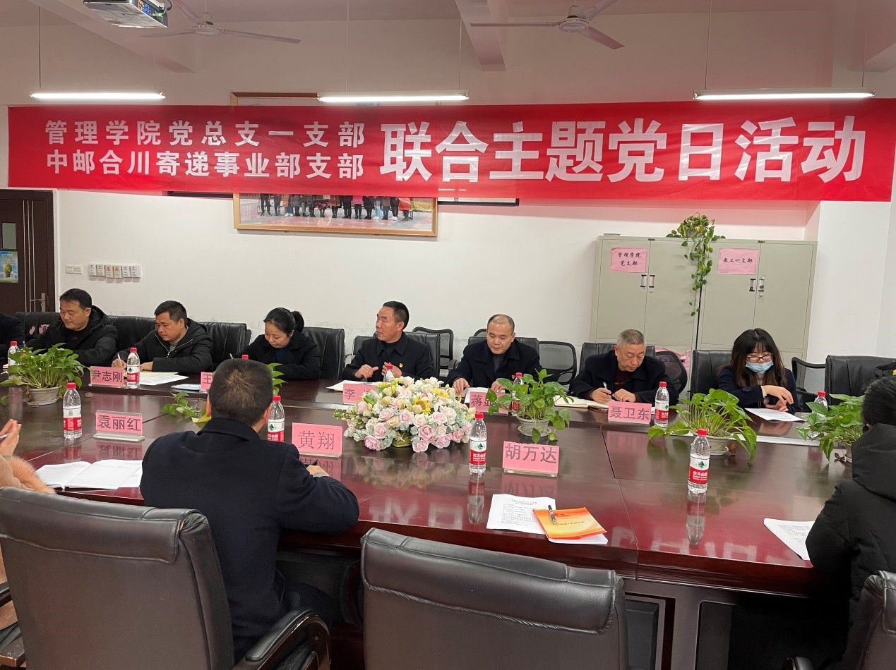 为进一步推进校企合作向纵深发展,以党建引领校企合作,实现校企双方优势互补与资源共享,推动产教深度融合,12月23日,管理学院党总支一支部与中邮合川寄递事业部支部开展联合主题党日活动。