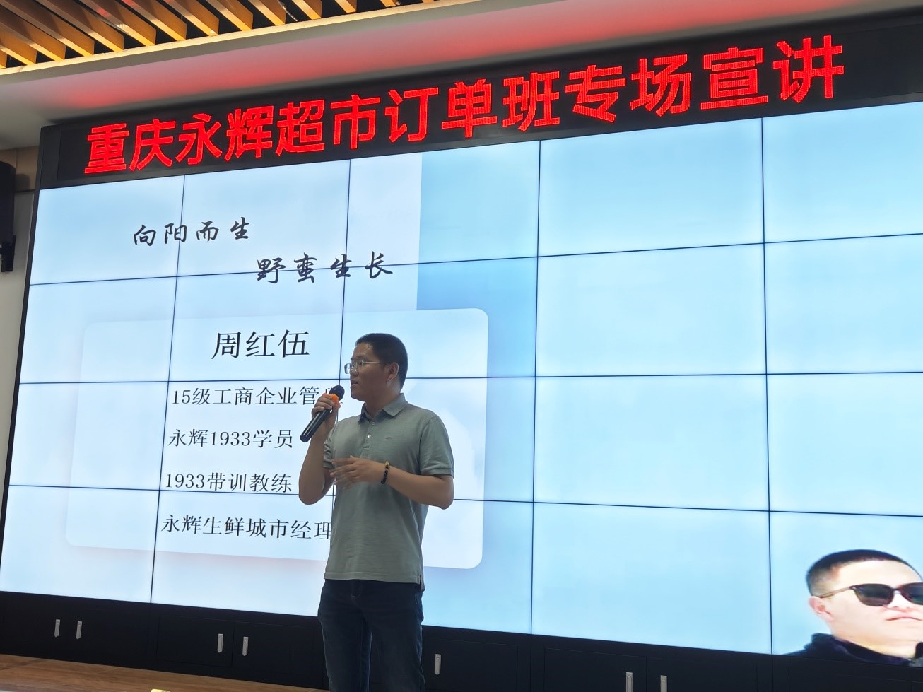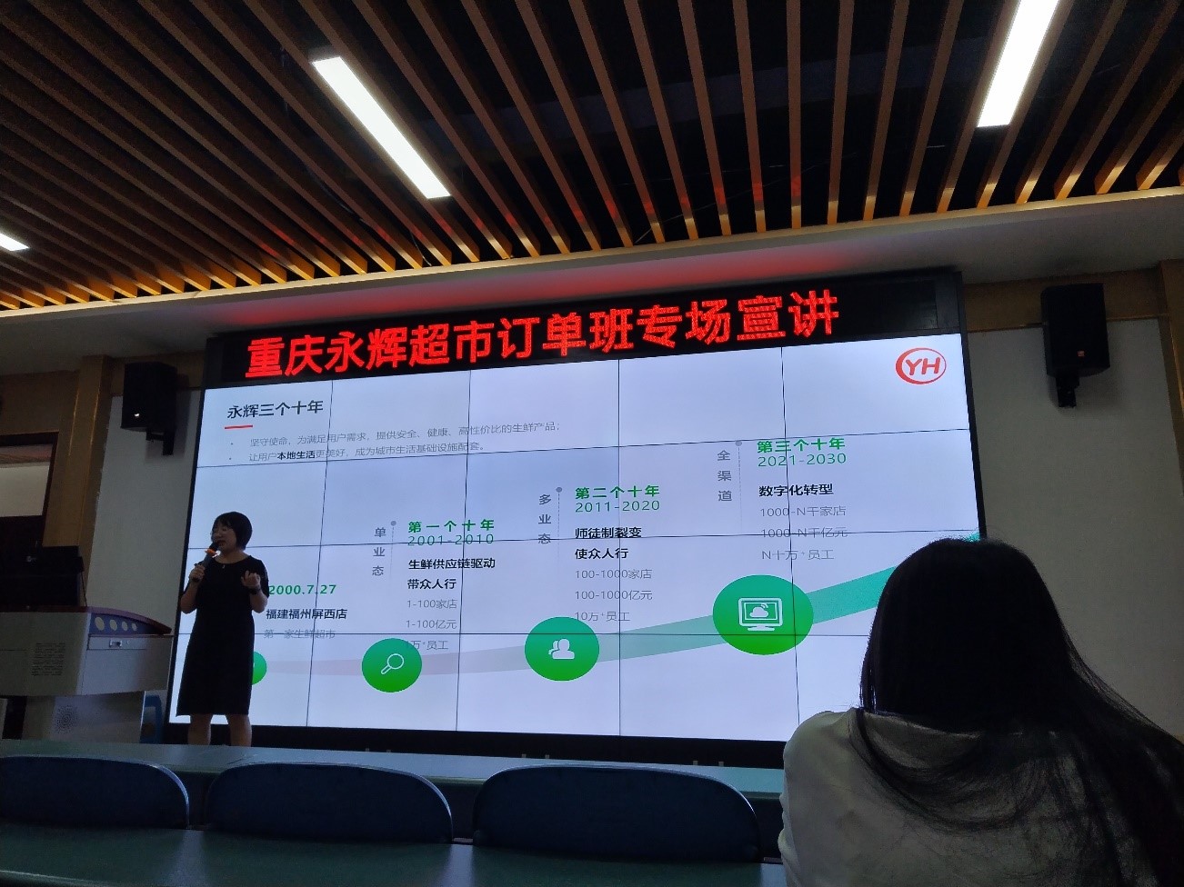 本次宣讲会首先由永辉超市人力资源部招聘培训经理梁磊向在场同学放映永辉超市视频宣传片,展示了永辉超市持续高质量发展历程,同时以PPT的形式介绍了企业的规章制度,福利待遇,企业文化,着重介绍了永辉过去的十余年中,始终存在着一个特别的人才引进项目——“1933项目”。随后,通过该项目成功留在永辉工作的学长学姐们分享了自己的成长故事,并现场解答了同学们的疑问。