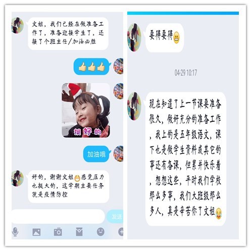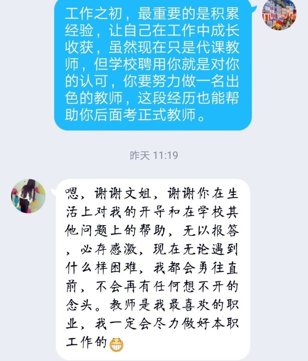 “文姐,我已经在做准备工作迎接学生了,还接了班主任工作。”这是田xx成功找到工作后给辅导员发来的喜讯,为了方便照顾爷爷,她在当地一所公办小学当语文代课老师,一边工作一边继续考教师资格证。“现在知道上一节课要准备多久了,必须要做好充分准备才行……累并快乐着。”田xx很乐意向辅导员诉说内心的真实感受,辅导员也为学生高兴,并建议她,即使是一名代课老师,也要认真对待这份职业,认真对待每一个学生,不忘教师的初心。