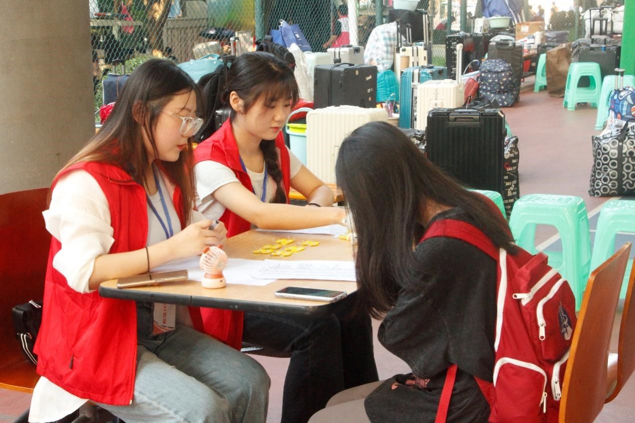 报到时,全院上下齐动员,设立接待处、报到处、行李寄存处3处迎新工作站,共计100余名师生志愿者参与迎新工作,积极为新生引导和服务:开设“绿色通道”,为家庭经济困难学生顺利入学护航;志愿者们在现场耐心为新生答疑解惑,引导新生顺利完成报到流程。