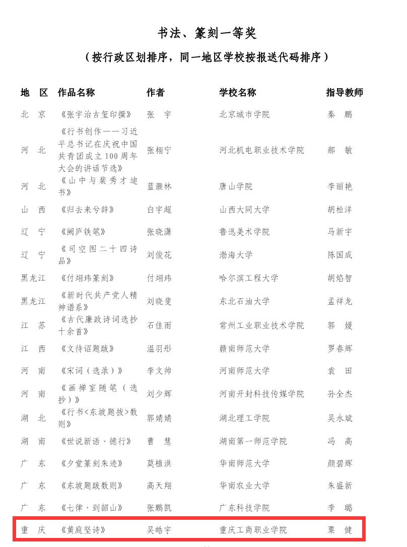 6月11日,教育部公示了全国第七届大学生艺术展演活动评选结果。管理学院清风轩书画社的吴皓宇同学荣获书法类一等奖(指导教师粟健),这是重庆市送往全国作品中唯一的书法一等奖。此外,吴皓宇和社团许奕杨、李明欣也荣获重庆市大学生艺术展演书法一等奖。